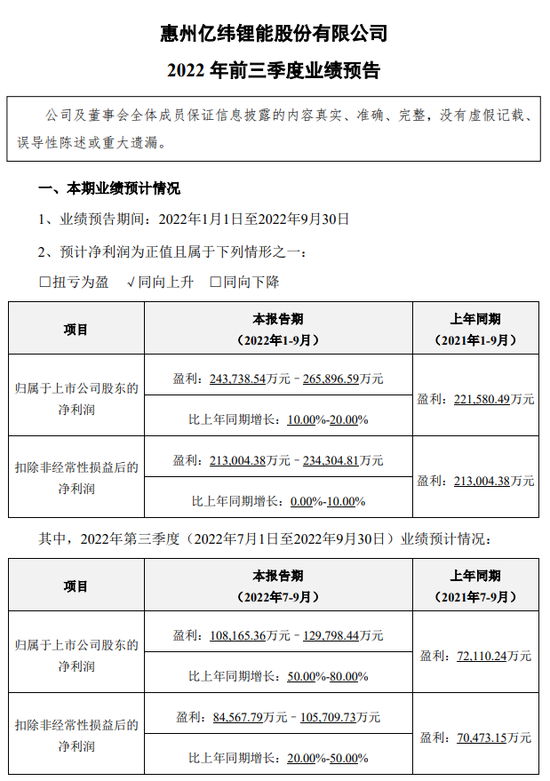 此外,亿纬锂能昨晚发布2022年前三季度业绩预告。预告显示,预计2022年前三季度归属于上市公司股东的净利润约24.37亿元~26.59亿元,同比增长10%~20%。其中第三季度预计净利润增长50.00%-80.00%。对于业绩变动原因,亿纬锂能表示,在对参股公司思摩尔国际控股有限公司投资收益同比下降幅度较大、公司持续加大研发投入的前提下,公司2022年前三季度业绩与上年同期相比仍实现正向增长,主要原因包括,在上游主要材料价格急剧上涨的背景下,公司秉持和谐发展原则,适时调整产品定价机制,各产品线的盈利能力得到较好修复。此外,公司主业电池业务发展良好,随着新工厂、新产线进入量产阶段,公司的出货规模增长迅速,2022年前三季度营业收入及主业利润均同比增长约110%。