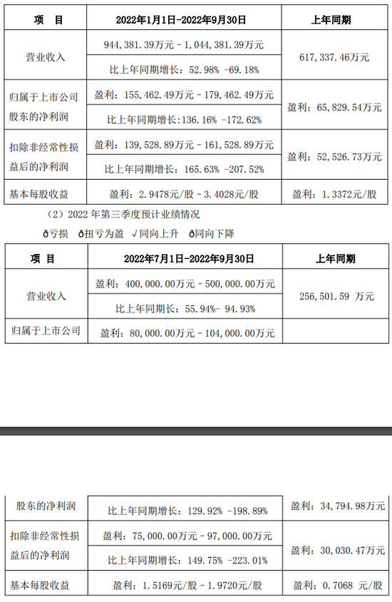 10月10日,宁德时代发布的2022年前三季度业绩预告显示,公司前三季度预计实现归母净利润165亿元至180亿元,同比增长112.87%至132.22%;其中第三季度预计实现归母净利润88亿元至98亿元,同比增长达169.33%至199.94%。对于业绩变动的原因,宁德时代称,随着国内外新能源行业快速发展,动力电池及储能产业的市场持续增长。公司不断推出行业领先的产品解决方案,加强市场开拓力度,加之前期布局的产能释放,产销量明显提升,推动公司全球市场地位持续领先的同时,也实现了盈利规模的快速增长。