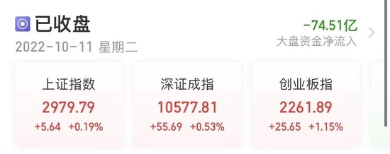 10月11日,A股三大指数震荡整理,创业板指表现较强。截至收盘,沪指涨0.19%,深成指涨0.53%,创业板指涨1.15%。北向资金全天净卖出12.44亿元,其中沪股通净卖出22.74亿元,深股通净买入10.3亿元。两市近3000只个股上涨。沪深两市今日成交额5638亿,较上个交易日缩量642亿,成交量缩至节前水平。