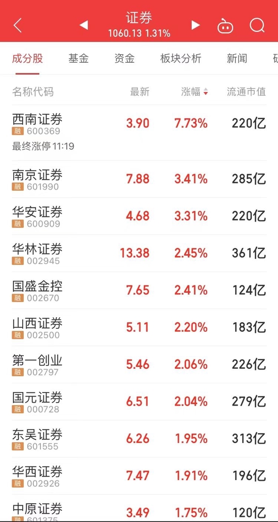截止收盘,券商板块11日收涨。个股方面,西南证券涨近8%,南京证券涨超3%,国盛金控(维权)、华安证券、华林证券等跟涨。