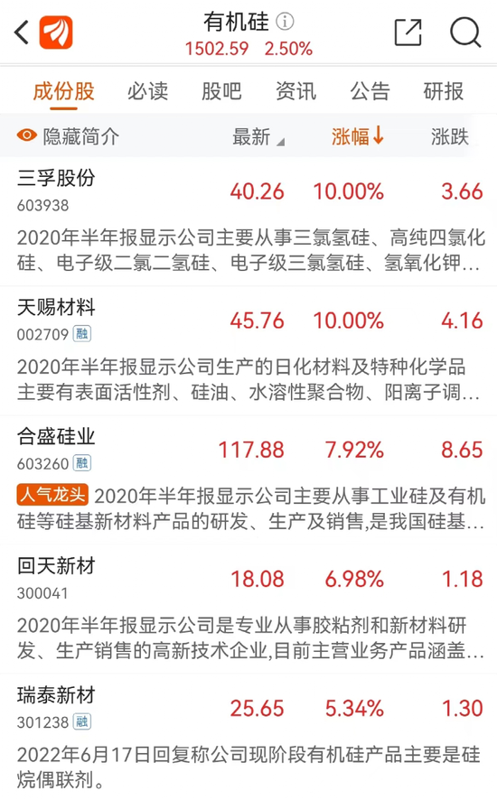 10月11日,在二级市场上,有机硅概念股也集体异动,三孚股份和新亚制程午后迅速涨停,包括合盛硅业截至收盘涨幅达7.92%,而回天新材、宏柏新材等概念股也纷纷涨逾5%。