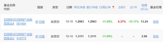 张林的第一只基金,招商移动互联网产业股票基金,A类和C类基金10号单日跌幅均达11.99%。这只基金规模还不小,合计达16.2亿元。