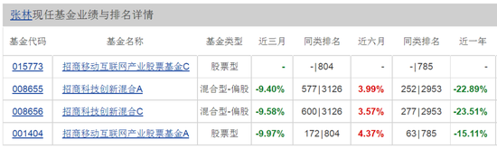 目前,张林现任的基金共四只,除了今年5月刚成立的招商移动互联网C,其余三只近一年收益都为负数。