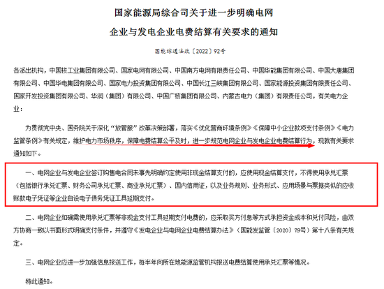 具体来看,国家能源局综合司关于进一步明确电网企业与发电企业电费结算有关要求中提到,电网企业与发电企业签订购售电合同未事先明确约定使用非现金结算支付的,应使用现金结算支付,不得使用承兑汇票、国内信用证,以及业务规则、业务形式、应用场景与票据类似的应收账款电子凭证等企业自设电子债务凭证工具延期支付。