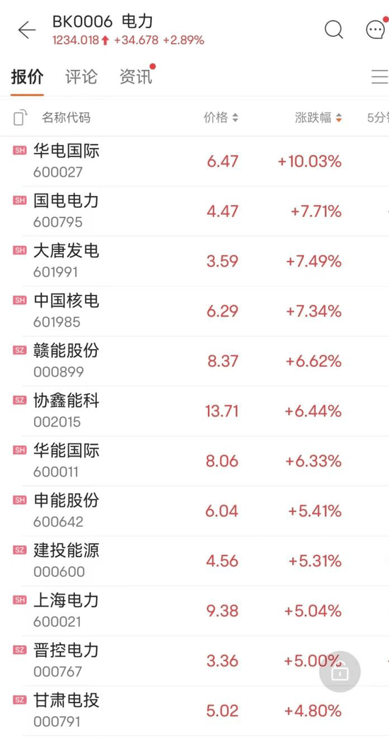截至当日收盘,A股方面,华电国际涨停,国电电力、大唐发电、中国核电涨超7%;H股方面,大唐发电收涨11.18%,华电国际电力股份收涨10.14%,中国电力、华能国际电力股份涨逾6%。