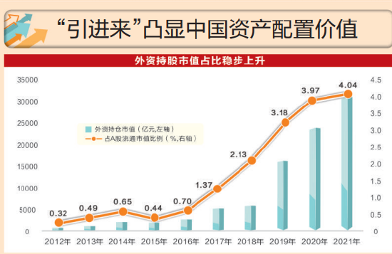 外资持仓流通市值占比稳步上升。截至2021年末,外资持仓市值占比达4.04%,刷新2020年3.97%的最高纪录。