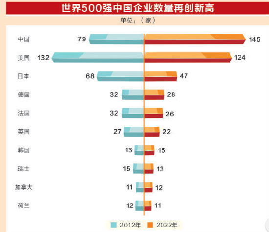 2019年世界500强名单中,中国上榜企业数量达到126家(包括中国香港、中国台湾,下同),首次超过多年雄踞榜首的美国;2022年中国上榜企业再创新高,达到145家,持续四年居世界之首,较十年前增加八成以上。中国大陆上榜129家,全面超越美国,体现中国企业的实力。