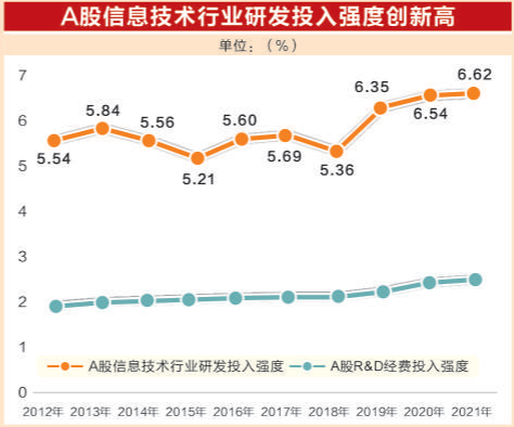 2016年至2020年,A股信息技术行业研发投入强度持续超越美股;2021年创新高,达6.62%。注册制实施以来,A股“科技”属性更加显著,2019年至2021年科创板研发投入强度持续超过10%。