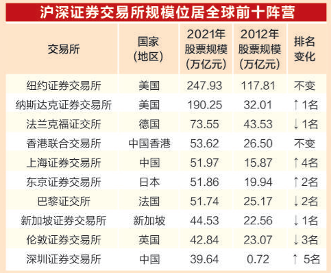 沪深交易所市值规模大幅跃升,稳居全球前十阵营。截至2021年末,上海证券交易所股票市值规模合计近52万亿元,较十年前增加超2倍,成为全球第五大证券交易所;深圳证券交易所成长最快,市值规模较十年前增加近54倍,接近40万亿元,超越韩国证交所、加拿大多伦多交易所以及澳大利亚证交所,成为全球第十大证券交易所。