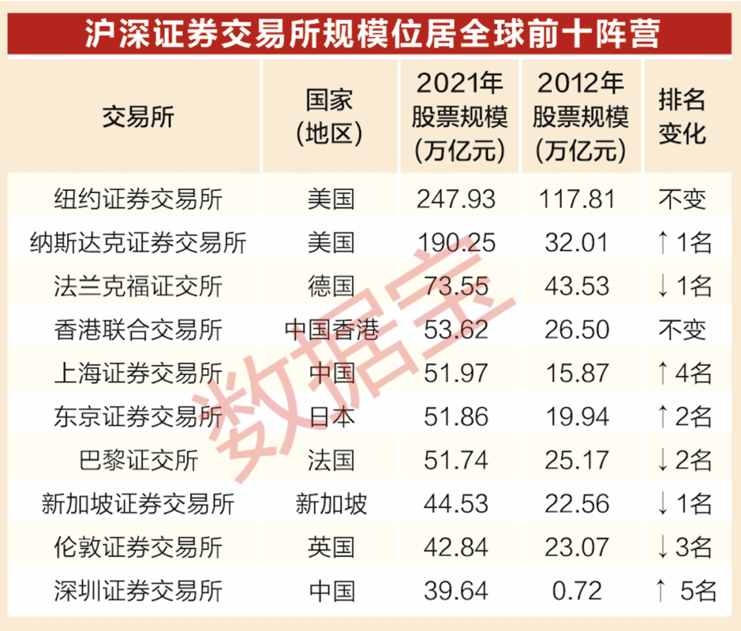 沪、深交易所市值规模大幅跃升,稳居全球前十阵营。截至2021年末,上海证券交易所股票市值规模合计近52万亿元,较十年前增加超2倍,成为全球第五大证券交易所;深圳证券交易所成长最快,市值规模较十年前增加近54倍,接近40万亿元,超越韩国证交所、加拿大多伦多交易所以及澳大利亚证交所,成为全球第十大证券交易所。