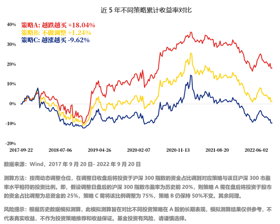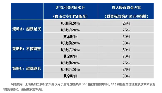 策略A:越跌越买。当沪深300指数处于历史前20%估值水平时,投入25%的资金;处于后20%估值水平时,投入75%的资金;其余时间则投入50%资金。