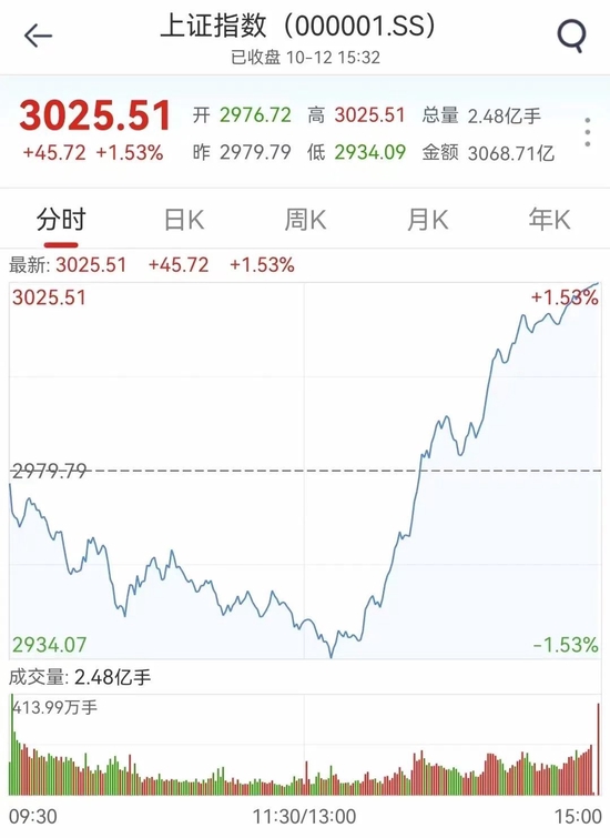 10月12日,A股三大指数V型反转暴力拉升。两市股指早盘弱势震荡下探,三大股指盘中跌幅均超1%,午后止跌回升,强势反弹,沪指涨超1.5%收复3000点,深成指涨超2%,创业板指涨超3%。