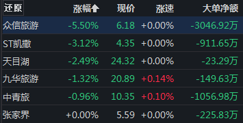 景点旅游微跌,众信旅游跌5%,天目湖、九华旅游等跟跌。