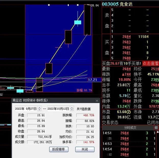 10月12日,热门股竞业达再度涨停,截至收盘,报26.84元,实现7连涨,其中有5个交易日达到涨停板,累计涨幅达68.7%。