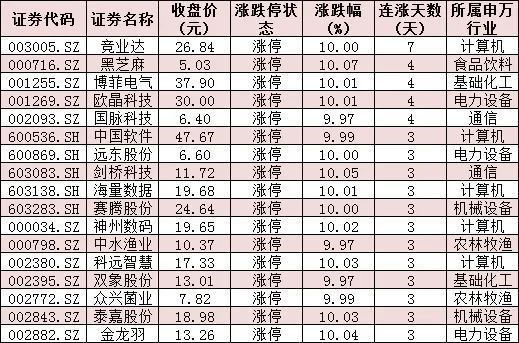 涨停板方面,10月12日,有91只个股涨停,其中,有17只涨停股,股价已连续上涨3个交易日以上。从行业方面看,计算机(17只)、机械设备(12只)、电力设备(11只)、电子(10只)等行业涨停股居前,均在10只及以上。