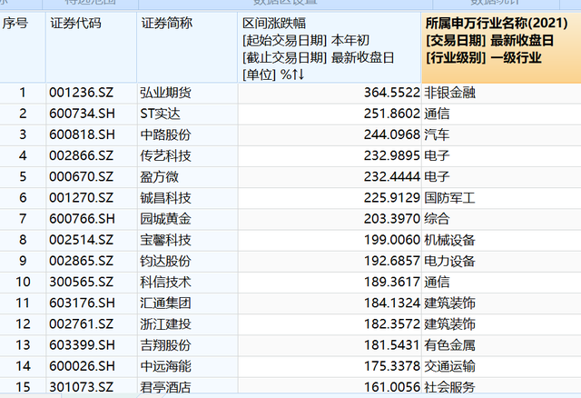 次新股弘业期货累计涨幅高达364.55%,暂列年内第一牛股;ST实达位列第二,且是唯一一只排进前十名的ST股。其次为中路股份、传艺科技(002866.SZ)、盈方微(维权)(000670.SZ)。