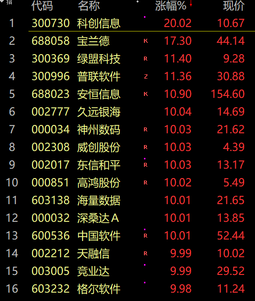 信创概念股掀涨停潮,软件、数字货币、网络安全等全线爆发,科创信息、中科江南20CM涨停,南天信息、中国软件、金桥信息、格尔软件等超20股涨停或涨超10%。