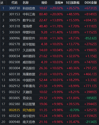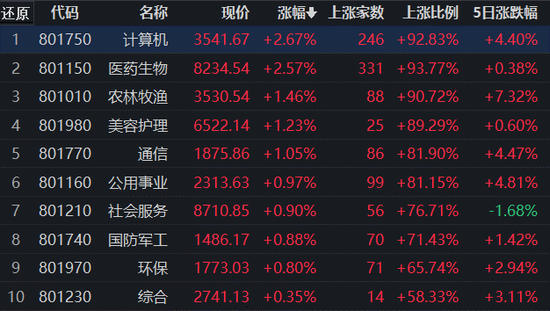 10月13日,申万一级行业中计算机行业领涨,涨幅达2.67%,获得9.91亿元大单资金的净流入。行业265只交易中的个股,有247只上涨,占比93.21%,其中,50只个股涨幅超5%。