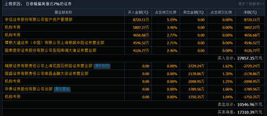 据同花顺机构成功率回测显示,中信证券股份有限公司客户资产管理部买入8720.11万,该营业部买入后,次日上涨概率61%,平均盈利1.04%。收益率最高的是持股30天后卖出,收益率5.60%,成功率50%。机构专用买入5807.27万,该营业部买入后,次日上涨概率50%,平均盈利0.39%。收益率最高的是持股1天后卖出,收益率0.39%,成功率50%。