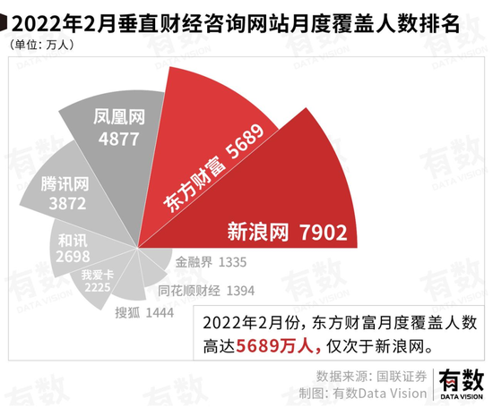 根据艾瑞咨询的数据显示,2022年2月份,东方财富月度覆盖人数高达5689万人,仅次于查股网。