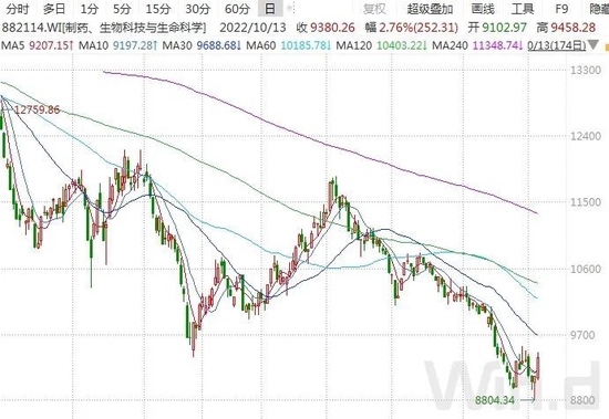 如涨幅第一的生物制药板块,今年以来板块整体呈现震荡下跌的走势,且近期指数已经跌破4月底的低点,走势明显弱于大盘指数。事实上,从行业整体业绩表现来看,依旧保持较高增速,板块龙头药明康德(维权)2022年10月12日晚间发布公告称,预计前三季度净利73.8亿元,同比增107.12%,亦超出市场预期。