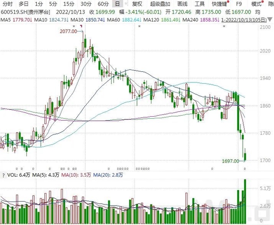 大幅增长的业绩并未给公司股价带来支撑,10月13日,公司股价低开低走放量下跌3.41%,成交额突破100亿元,股价亦跌破1700元整数关口。