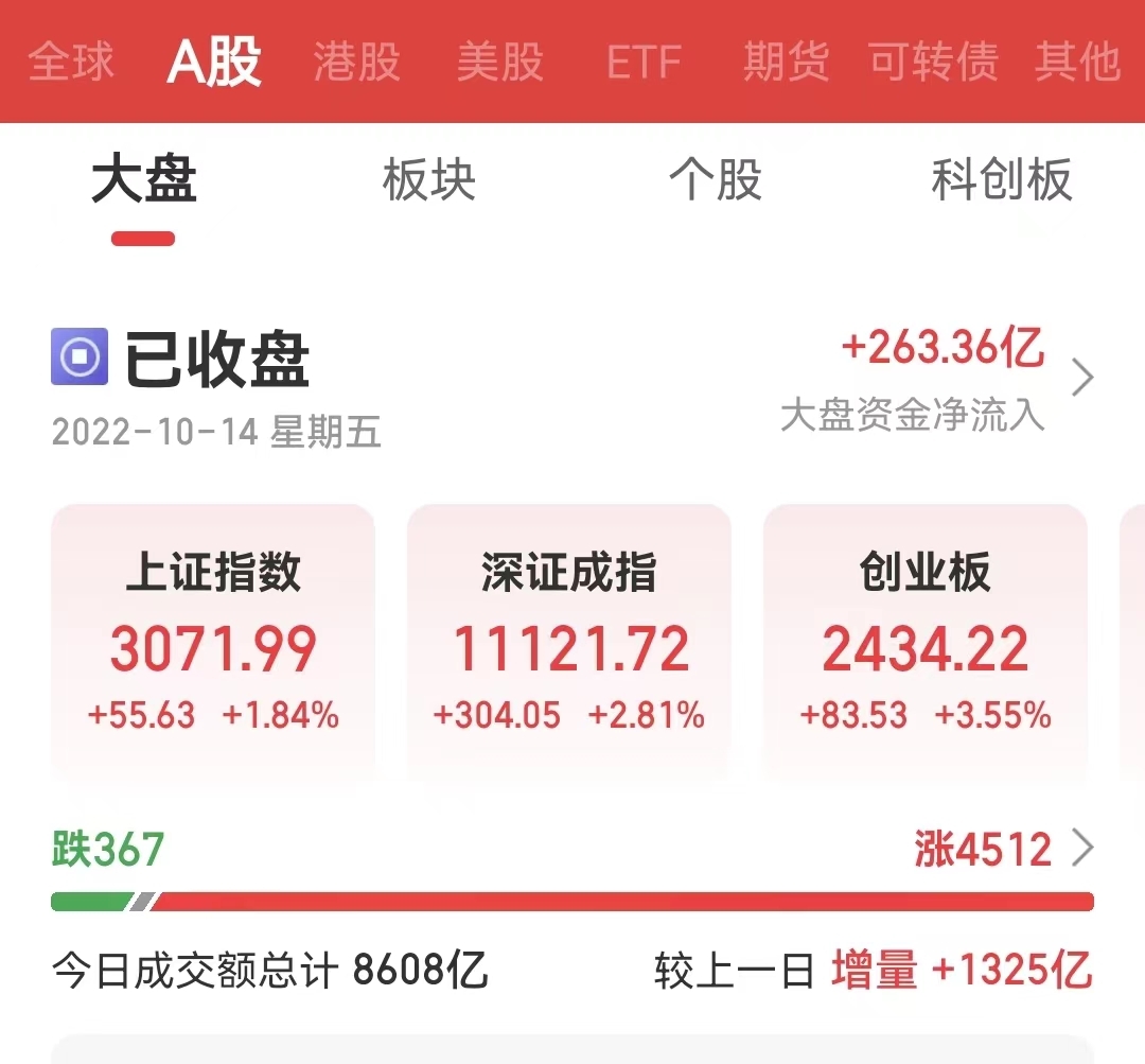 10月14日,A股迎来强势反弹。早间,三大指数集体高开,随后逐步扩大涨幅。截至收盘,上证指数涨1.84%,报3071.99点,深证成指涨2.81%,报11121.72点,创业板涨3.55%,报2434.22点。