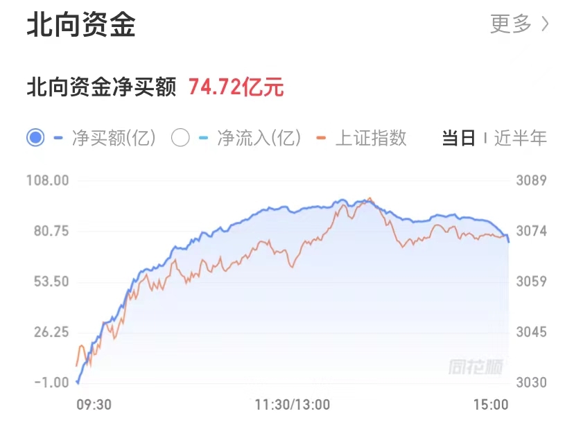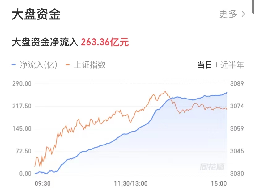 成交方面,今日成交额总计8608亿元,北向资金净买额达74.72亿元,大盘资金净流入263.36亿元。