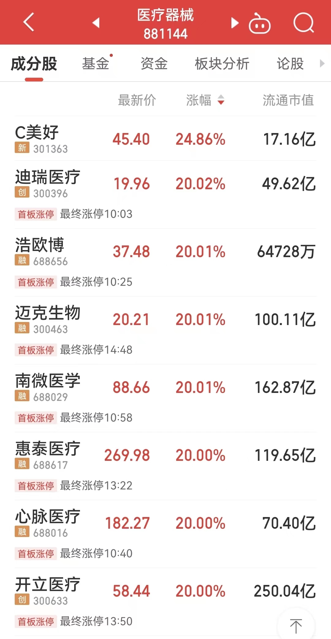 C美好、迪瑞医疗、浩欧博、迈克生物、南微医学、惠泰医疗等个股“20cm”涨停。