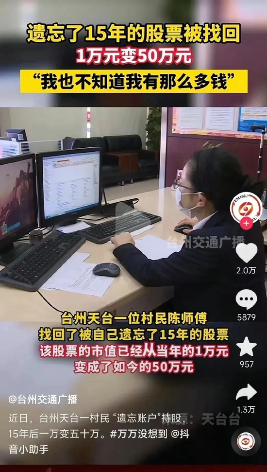 近日,浙江台州,据台州交通广播报道,村民陈师傅遗忘15年前花一万元买的股票被银行工作人员发现后找回,结果已经价值五十万元。银行工作人员称他们在排查账户信息时发现他的账户信息非常老旧,投资又有大比例盈利,因此当时他们推断陈师傅应该是把这个账户给遗忘了。陈师傅表示自己也没想到突然有这么多钱。