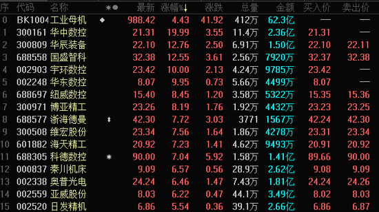 工业母机板块早盘强势走高,华东数控、宇环数控、华中数控均封板,合锻智能、欧科亿、华辰装备等涨超5%。