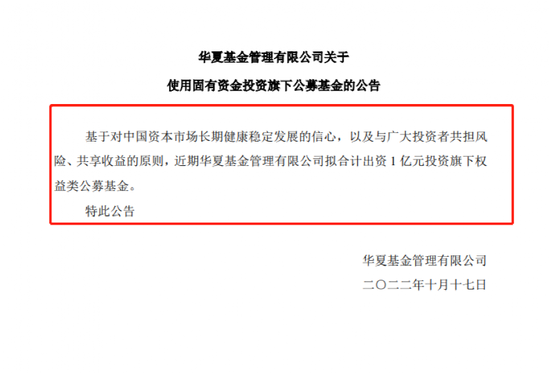 华夏基金10月17日宣布,基于对中国资本市场长期健康稳定发展的信心,以及与广大投资者共担风险、共享收益的原则,近期华夏基金拟合计出资 1 亿元投资旗下权益类公募基金。