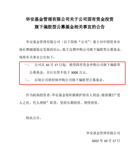 10月17日,继易方达、南方、汇添富基金、国泰君安资管、中泰证券资管等机构发布自购公告后,华夏、广发、嘉实、华安等基金公司也快速跟上,拿出“真金白银”自购公司旗下权益类产品。