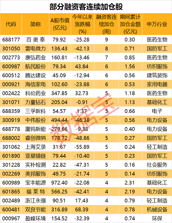 哪些股票获得融资客持续加仓?数据宝统计,截至上周五,融资客连续加仓两周以上的股票共计217只。分行业看,这些公司主要扎堆医药生物、机械设备、电力设备、电子、基础化工等大行业。医药生物行业入围数量最多,有29家公司名列其中。