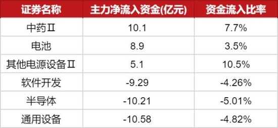 从二级市场划分来看,净流入前三的行业为中药、电池、其他电源设备,净流入额分别为10.1亿、8.9亿、5.1亿。净流入后三的行业是软件开发、半导体、通用设备,净流出额分别为9.29亿、10.21亿、10.58亿。
