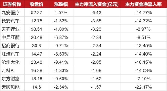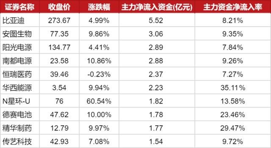 主力资金净流入前3的个股是比亚迪,安图生物,阳光电源,净流入额分别为5.52亿、3.06亿、2.89亿。主力资金净流出前3的个股是九安医疗,天齐锂业,长安汽车,净流出额分别为6.43亿、3.55亿、3.23亿。