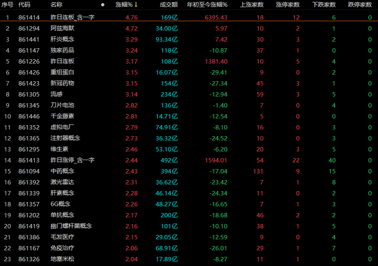 中药概念涨幅超过2%,131只相关个股上涨,江中药业等9只个股涨停,片仔癀收涨1.41%报272.35元/股,云南白药、华东医药涨幅均约3%。