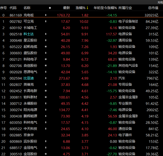 充电桩概念涨幅近2%,可立克、长城电工、科士达涨停,比亚迪今日高开高走收涨4.99%报273.67元/股,阳光电源、中天科技(维权)涨幅均超过4%。