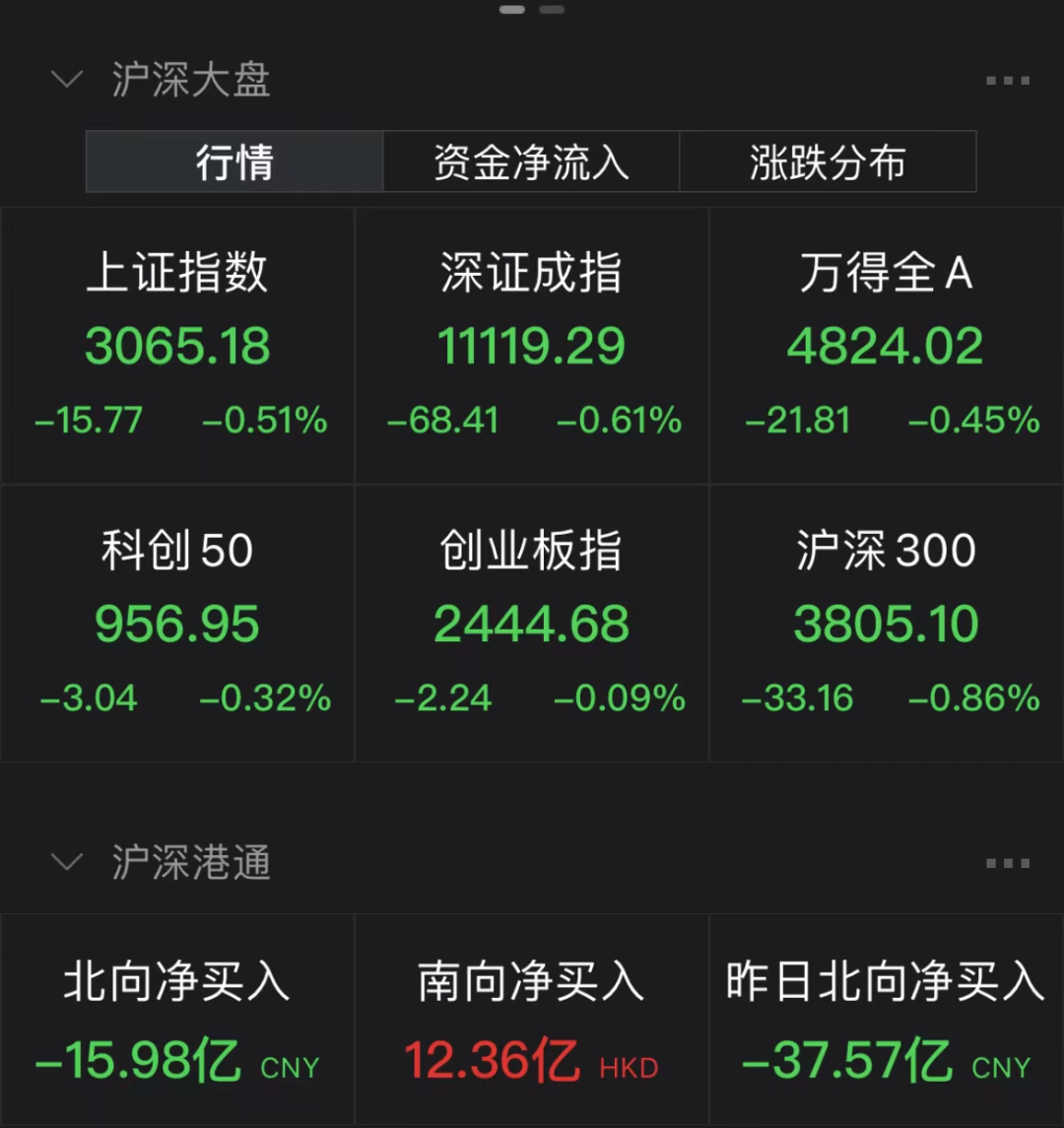 19日上午,A股小幅震荡调整,截至上午收盘,上证指数下跌0.51%、深证成指下跌0.61%、创业板指下跌0.09%,北向资金净流出15.98亿元。