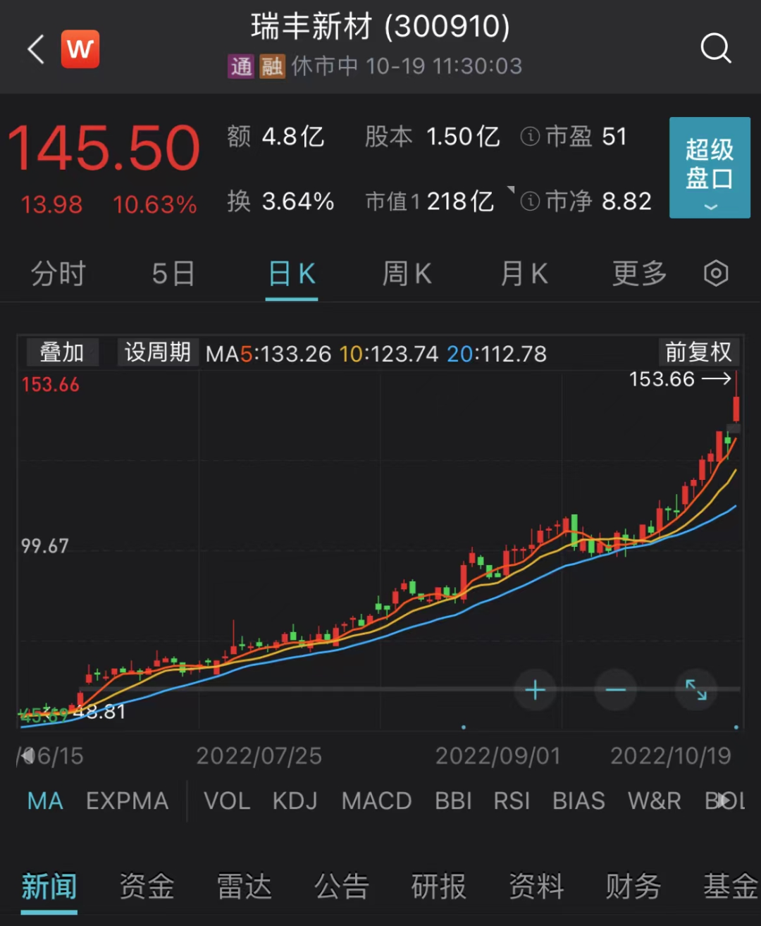 今日上午,瑞丰新材最高涨超16%,上午收盘上涨10.63%,股价再创历史新高。