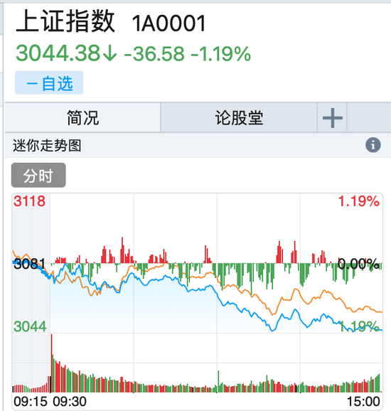 截至收盘,沪指跌1.19%报3044.38点,深成指跌1.43%报11027.24点,创业板指跌0.86%报2425.96点。