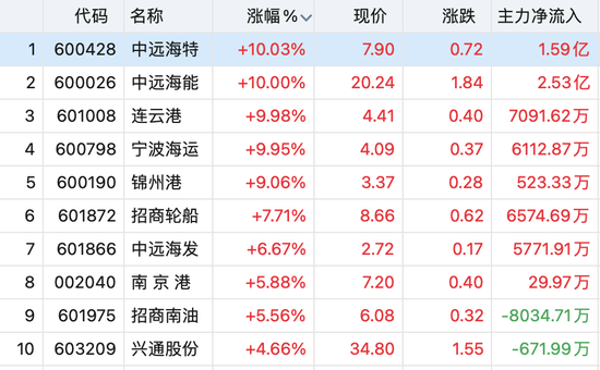 港口航运板块涨幅居前,中远海能、连云港、宁波海运、中远海特涨停,招商轮船、长航凤凰、南京港等跟涨。