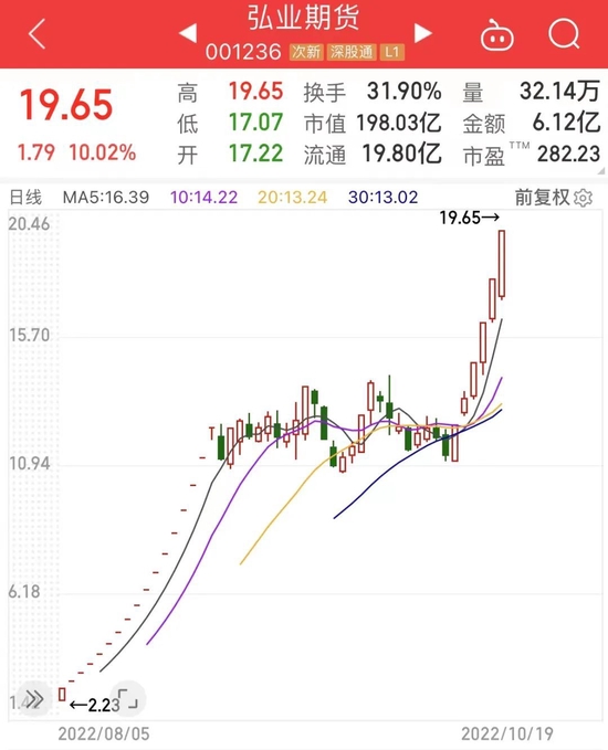 10月19日,弘业期货再度涨停,实现四连板,报收19.65元/股,股价创历史新高;与发行价相比,累计涨幅达9.56倍。