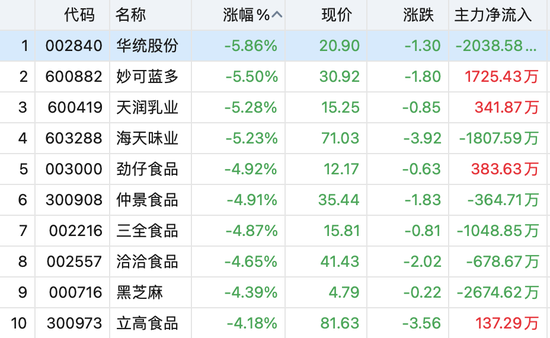 同时,食品加工及制造板块震荡走弱,海天味业、天润乳业、妙可蓝多跌逾5%,三全食品、恰恰食品、益客食品、仲景食品、桃李面包等跟跌。