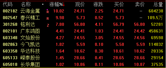 一体压铸概念发力走高,截至发稿,云海金属、春兴精工涨停,铭利达涨近8%,广东鸿图、文灿股份涨超4%。