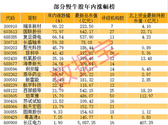 上述个股慢牛走势特征明显,今年股价从未涨停过。这种慢牛走势的个股在A股市场并不多见。数据显示,剔除次新股后,今年股价创出历史新高、最新价较高点跌幅不足10%且从未涨停过的个股,只有19只,国联股份、新雷能等股价10年涨幅超过十倍。