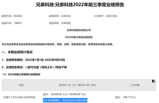 兄弟科技日前发布的三季报预告显示,公司预计今年前三季度实现归属于上市公司股东的净利润为2.6亿元至3亿元,同比增长8621.61%至9963.40%。