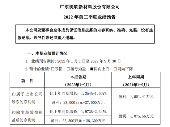 美联新材日前披露的2022年前三季度业绩预告显示,公司预计今年前三季度实现归属于上市公司股东的净利润为2.3亿元至2.7亿元,同比增长1354%至1607%。