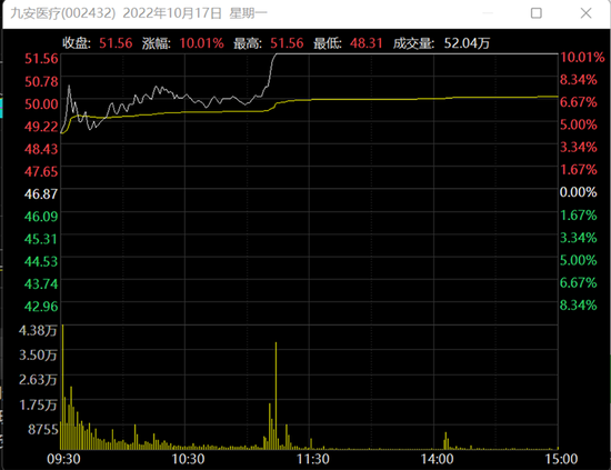 10月14日(周五),九安医疗股价上涨6.31%,10月17日(周一),九安医疗高开,临近中午时强势封涨停板,并以涨停报收。