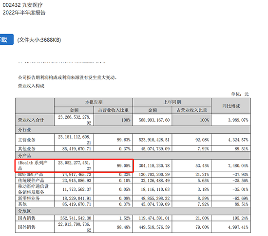 据九安医疗2022年半年度报告显示,报告期内,iHealth系列产品占九安医疗营业收入的比重达99.08%。